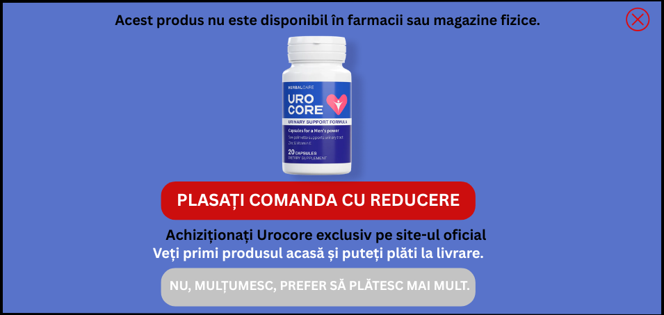 UROCORE este un supliment alimentar sub formă de capsule conceput pentru susținerea sănătății prostatei și a tractului urinar la bărbați, având ingrediente naturale care pot contribui la reducerea simptomelor asociate prostatitei și altor afecțiuni prostatice. Produsul este utilizat pentru îmbunătățirea urinării, reducerea disconfortului și menținerea sănătății masculine pe termen lung, fiind recomandat în cazuri de prostatită acută sau cronică, hiperplazie benignă de prostată, senzație de arsură la urinare, urinări frecvente sau jet urinar slab, dar și preventiv la bărbații peste 50 de ani. Capsule gelatinoase albe sau crem sunt ambalate în flacoane sau blistere cu 30, 60 ori 90 de bucăți și se administrează în doză de 1–2 capsule pe zi după masă, timp de aproximativ 1–3 luni, conform recomandării medicului. Nu trebuie utilizat de persoane alergice la ingrediente, iar reacțiile adverse posibile includ manifestări alergice sau disconfort gastric, caz în care administrarea trebuie întreruptă și consultat medicul; de asemenea, se recomandă evitarea alcoolului în timpul tratamentului. Produsul se păstrează sub 25°C, ferit de lumină și de copii, iar respectarea termenului de valabilitate este obligatorie. Majoritatea utilizatorilor raportează ameliorarea urinării și reducerea nevoii nocturne de a urina după câteva săptămâni, deși rezultatele pot varia individual, existând și opinii neutre sau negative legate de eficiență. UROCORE poate fi cumpărat online la preț promoțional de 159 lei în loc de 318 lei, cu livrare rapidă și garanția autenticității produsului.